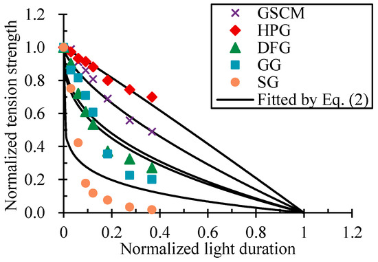 The nonlinear variation in these scatters was observed in each test series of Figure 10, where the relationship between the normalized tension strength and light duration can be described by Equation (2):