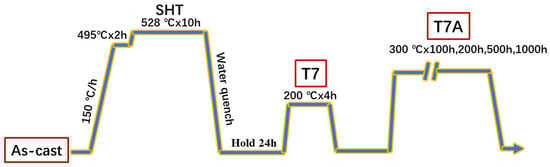 The traditional T7 treatment was applied to all the samples after casting, which included a two-step solution treatment (495 °C for 2 h and 528 °C for 10 h and water quenching), followed by an artificial aging treatment (200 °C for 4 h). To investigate the thermal stability of the experimental alloys at elevated temperatures, thermal exposure at 300 °C for varying durations (100, 200, 500, and 1000 h) was applied to the samples, under the T7 condition. These samples, after thermal exposure, were referred to as the T7A samples, identified as “T7Axxx”, where “xxx” stands for the different exposure time in hours. Figure 1 shows the heat treatments applied to the samples.