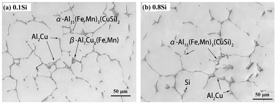 In general, the as-cast microstructures of the four experimental alloys were similar. These alloys were composed of α-Al, Al2Cu, and Fe-rich intermetallic phases (Figure 2), which were identified by an energy-dispersive X-ray spectrometer (EDS) attached to the SEM. However, differences in the Fe-rich intermetallic phases in the four alloys were observed. The variety and morphology of the intermetallics were dependent on the Si content. For example, two types of Fe-rich intermetallics were observed in the 0.1Si alloy (Figure 2a): plate-like Al7Cu2(Mn, Fe), known as β-Fe, and Chinese script-like Al15(Mn, Fe)3(Cu, Si)2, known as α-Fe. In contrast, only α-Fe was observed in the high Si (0.8Si) alloy (Figure 2b). This indicates that the addition of Si can suppress the transformation of β-Fe, while promoting α-Fe during solidification, which has also been reported in previous studies [10,23]. In addition, the formation of small Si particles was observed in the 0.8Si alloy (Figure 2b).