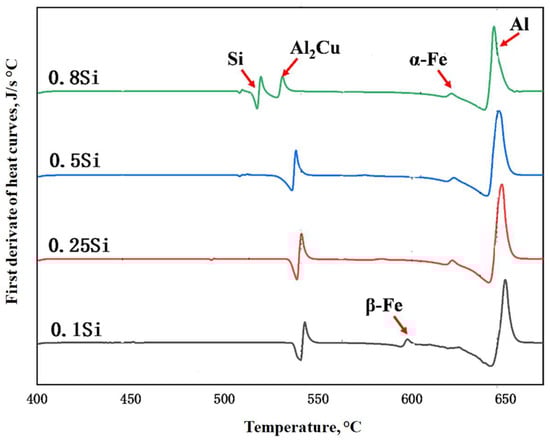To confirm the as-cast microstructures, DSC analysis was conducted on the four experimental alloys. The first derivatives of the DSC heating curves are shown in Figure 3. The peaks were indexed according to their formation temperature and the findings in previous studies [23,24]. Moreover, β-Fe and α-Fe were indexed in terms of the 0.1Si alloy, similar to the microstructure shown in Figure 2; additionally, the intensity of the β-Fe peak continually decreased with increasing Si content. Finally, only α-Fe was observed in the alloys with higher Si content (0.5Si and 0.8Si alloys). An Si peak was only detected in the 0.8Si alloy, confirming the presence of Si particles (Figure 2b).