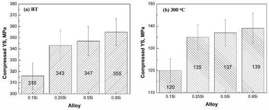 Compressive YS of four experimental alloys under the T7 condition at: (a) room temperature and (b) 300 °C.