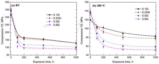 The long-term thermal stability of the mechanical properties of high-temperature resistant Al alloys is a critical aspect. Figure 7 shows the compressive YS of the experimental alloys at room temperature and 300 °C after varying exposure durations (up to 1000 h). Because of the coarsening process of θ′ precipitates during thermal exposure (Figure 5), the compressive YS decreased with the increasing duration of exposure at room temperature and 300 °C for all the alloys. All the YS values exponentially decreased during the early stages of thermal exposure (100–200 h). Thereafter, the rate of reduction decreased or plateaued with prolonged exposure. For example, the YS of the 0.5Si alloy at 300 °C decreased from 137 MPa under the T7 condition to 71 MPa under the T7A200 condition (Figure 7b); thereafter, the YS value decreased to 59 MPa under the T7A1000 condition.
