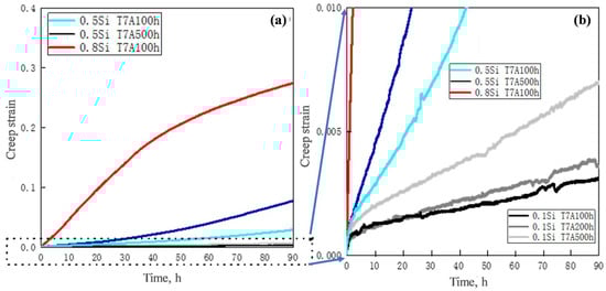 During creep deformation at an elevated temperature, the creep strain of the 0.1Si alloy under three conditions increased rapidly in the first few hours. Thereafter, this value gradually increased with the creep time, which showed that the creep was entering the quasi-steady stage. The minimum creep rate and total strain increased with the increasing exposure time (Figure 8a and Table 4). The T7A500h sample exhibited the highest minimum creep rate (1.6 × 10−8 s−1) and total strain (0.007).