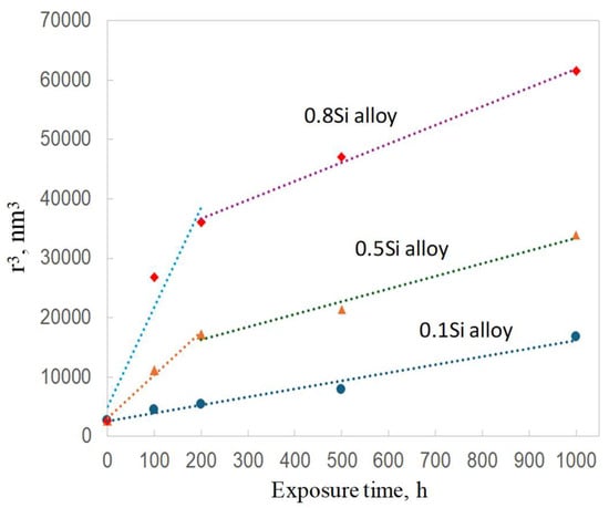 The lower reduction in the mechanical properties of the alloys with a high amount of Si after exposures of 200–500 h was likely due to the reduction in the k values during the second stage (Figure 7). In addition, the k values during each stage for the 0.5Si alloy were lower than those of the 0.8Si alloys (73 vs. 167 and 21 vs. 31, Table 5). This resulted in the 0.5Si alloy exhibiting higher mechanical and creep properties than the 0.8Si alloy during thermal exposure.