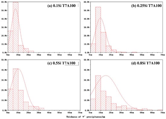 The two-stage coarsening rates of the θ′ precipitates in the alloys with a high amount of Si during thermal exposure can be explained by the interaction between the Si and the θ′ precipitates. In this study, two coarsening mechanisms are proposed (Figure 10). First, the coarsening of the precipitates via a conventional mechanism resulted in the consumption of the dissolvable, smaller precipitates [33,34], which could be applied to all experimental alloys. However, the number density of the θ′ precipitates increased with the increasing Si content (Figure 3 and Table 2), resulting in lower diffusion distances between the precipitates and a higher coarsening rate. The higher the Si content, the higher the number density of the θ′ precipitates and the higher the coarsening rate were. The second mechanism is related to the Si clusters/nanoparticles that are connected to the θ′ precipitates in the alloys with a high amount of Si. The high Si alloys presumably contain two types of θ′ precipitates, Si-rich θ′ and Si-deficient θ′ precipitates, caused by the nonuniform distribution of Si clusters/nanoparticles. Owing to the high diffusion rate of Si, the coarsening of Si-rich θ′ precipitates, which were in the proximity of the Si clusters/nanoparticles, would generally occur at a higher rate than that of Si-deficient θ′ precipitates. Additionally, some Si-rich θ′ precipitates transfer to the coarse equilibrium θ phase. The segregation of Si solutes to form θ′ precipitates was greater in the alloys with a high amount of Si than that of the alloys with a low amount of Si; therefore, the coarsening of the precipitates occurred at a higher rate in the former than that in the latter. Thus, the size distribution of θ′ precipitates in alloys with a high amount of Si will likely be wider than that of alloys with a low amount of Si. This was confirmed by the thickness distribution of the different alloys during thermal exposure (Figure 11), which was identified from the image analysis results of the precipitates under various conditions in the TEM images. The θ′ precipitate thickness of the 0.1Si alloy after 100 h of exposure (T7A100) was distributed within a narrow range (Figure 11a); additionally, a thickness of approximately 80% of the θ′ precipitates was similar to the average value. The θ′ thickness increased and was distributed over a wider range as the Si content increased, indicating that thick θ′ precipitates were present in the alloys with a high amount of Si owing to the Si segregation and the resulting high coarsening rates. The thickness of most of the 0.8Si alloy’s θ′ precipitates ranged from 5 to 40 nm (Figure 11d), whereas that of the alloys with a low amount of Si ranged from 5 to 15 nm (0.1Si and 0.2Si alloys, Figure 11a,b). Increasing the duration of thermal exposure reduced the available source of coarsening in the alloys with a high amount of Si, such as the dissolvable, small size of the θ′ precipitates (Figure 5), leading to the second stage exhibiting lower coarsening rates than that of the first stage. In contrast, the variation in the thickness of θ′ precipitates in the 0.1Si alloy was lower than that of the alloys with a high amount of Si (Table 3), resulting in a constant coarsening rate in the alloys with a low amount of Si.