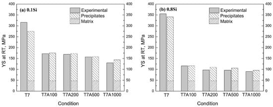 As mentioned above, Si enhanced the formation of θ′ precipitates under the T7 condition, resulting in the augmentation of the number density and volume fraction of θ′ precipitates in the alloys with a high amount of Si. Therefore, the YS of the alloys with a high amount of Si is expected to be higher than that of the Si alloys with a low amount of Si under the T7 condition (confirmed by Figure 12). In contrast, Si accelerated the coarsening of θ′ precipitates during thermal exposure at an elevated temperature, leading to a lower number density of θ′ precipitates in the alloys with a high amount of Si. As the main θ′ precipitate strengthening contribution decreased with the increasing Si content, the YS of the 0.8Si alloy was assumed to be lower than that of the 0.1Si alloy (prediction in Table 5 and Figure 12).