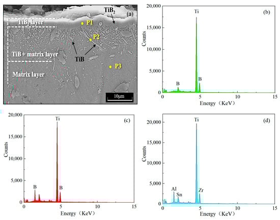 Figure 2a shows the typical characteristics of the surface boride layer on the cross-section of the Ti−5.1Al−2.0Sn−3.7Zr−0.3Mo−0.3Si alloy. It can be seen in Figure 2a that the boride layer exhibited a structure of a monolithic TiB2 outer layer and an inner layer of whisker TiB penetrating into the substrate. Similar morphologies have been confirmed in various dual-phase titanium alloys [3,4]. The different morphologies between TiB2 and TiB layers may be attributed to the different preferential growth directions of TiB2 and TiB crystals [21]. It is generally known that the hexagonal TiB2 has a preferential growth direction on ab plane perpendicular to the [0001] direction, selectively forming a dense structure [21,22], while TiB has a preferential growth direction of [010], and there are some specific orientation relationships between TiB and titanium substrates, resulting in needle-like or whisker-like morphology along the [010] direction [3]. In both the TiB2 and TiB layers, no obvious microcracks or holes were observed, showing a good bonding structure between the boride layer and the substrate. The density measurements indicate that the density of the alloy increased from the original 4.5 g/cm3 to an average value of 4.73 g/cm3 after the boriding process, confirming the densification of the alloy. It is worth noting that a lot of short flaky or irregularly shaped TiB with sub-micron sizes (<0.7 μm) were also observed in the TiB + matrix layer. These sub-micron-sized TiB may have been formed by the reaction (Ti + [B] = TiB) between active [B] diffused from boron source through the outer layer of TiB2 and Ti from the alloy substrate. When the thickness of the TiB2 layer reached a certain value, it hindered the diffusion of active [B] atoms into the alloy substrate, thereby limiting the growth of the boride layer and forming short flaky morphology [22,23,24]. Another reason may be the presence of micropores in the alloy during powder metallurgy preparation. As preliminary density measurements, the density of the alloy used in present study was 4.5 g/cm, which was 97.1% of the theoretical density [20]. This different density indicates the presence of micropores in the matrix, which acted as anchor sites for boron diffusion, forming sub-micron-sized TiB phases. More research details need to be confirmed in future work.