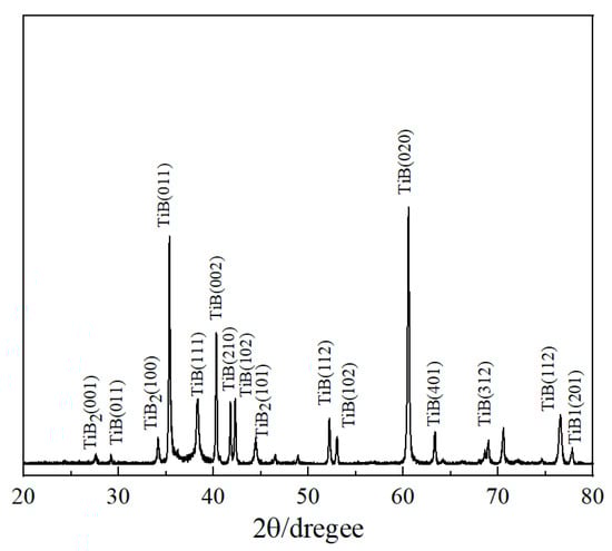 The EDS analyses show the presence of Ti and B in Figure 2b–c, as well as the main elements of the matrix in Figure 2d. The XRD measurements identified the existence of TiB2 and TiB phases as shown in Figure 3.