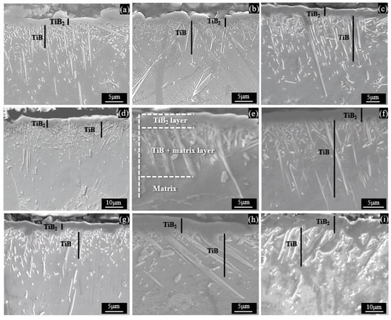 Figure 4 shows the SEM microstructure of Ti−5.1Al−2.0Sn−3.7Zr−0.3Mo−0.3Si alloys borided at different conditions. It can be clearly seen that there were three different regions, namely the outer layer of single TiB2, the inner layer of whiskers or discontinuous flaky TiB penetrating into the substrate and the substrate. The average thicknesses of the TiB2, TiB and total TiB2 + TiB layers at different boriding temperature and time are summarized in Table 2. The monolithic outer layer of TiB2 had a thickness of mostly less than 7 μm in all temperature ranges, and it had only a small portion of the total boride layer thickness. The whisker TiB had a thickness ranging from 7 μm to 23 μm under the present boriding conditions, and it accounted for a high proportion of the total boride layer thickness. Moreover, it can be seen from Figure 4a–d,g that the morphology of the alloy was characterized by a large number of sub-micron (<0.7 μm)-sized short flaky TiB phases under the boriding conditions of a relatively lower temperature (1273 K) and shorter time (5 h). With the increase of the boriding temperature and time, the TiB2 boride layer increased, and the TiB whiskers also became longer and thicker, while the tiny flaky TiB phase no longer existed in large quantities as shown in Figure 4e,f,h,i. According to above observations, it can be known that as the temperature and duration increased, surface [B] atoms became more active in diffusing into the substrate, resulting in an increase in the concentration of B atoms in the alloy matrix and accelerating the growth of the boride layer by merging small flake-like TiB phases.