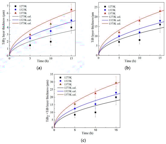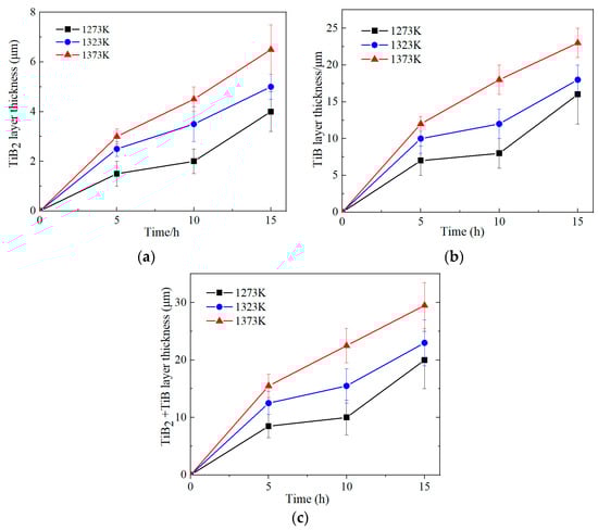 To clearly see the growth behavior of the boride layers, the variation relationships of boride layer thickness under different conditions are presented in Figure 5. The growth patterns of various boride layers were considered parabolic growth. As expected, the thickness of all boride layers increased with temperature and time. The outer layer of TiB2 showed a relatively slow growing tendency at the temperature of 1273–1323 K and heat treatment time below 10 h, followed by a relatively fast increase after 15 h. As the temperature rose to 1373 K, the thickness kinetic curve of the boride layers exhibited parabolic smooth growth. Since this temperature was well into the β-phase field of the alloy, the growth rate of boride layers was relatively higher than that at the temperature of 1273–1323 K. Similar growth behavior could be observed in TiB whisker, but the growth rate of this layer was much higher than that of TiB2. Due to the high proportion of TiB thickness out of the total layer, the growth kinetic curve of the total thickness of the boride layer was similar to that of the TiB layer.