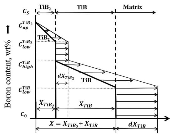 Schematic representation of B concentration profile across the boride layer. The X axis represents the depth from the surface (in μm). CS represents the B effective weight fraction in the boron source; is the upper and lower limits of B concentrations in TiB2, respectively; and denotes the lower and upper limits of B content in TiB; C0 is the solubility of B in the substrate, respectively.