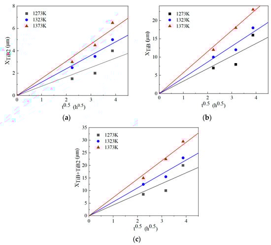 where and are the layers of TiB2 and TiB, and and are the parabolic growth constants at the TiB2/TiB and TiB/Ti interfaces, which can be determined by the linear fitting curve of and .