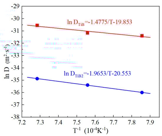 By taking natural logarithm of Equation (11), the activation energy and exponential factor were determined from the slope and intercept of linear fitting between lnD and 1/T shown in Figure 8. Thus, the diffusion coefficients of boron in the TiB2 and TiB layers are given as follows: