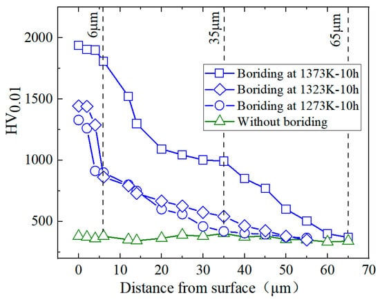 The variation of microhardness with distance from the surface directly affected the wear resistance of the alloy. Figure 10 presents the microhardness from the surface to the interior for the as-sintered and the alloys pack borided at different temperatures for 10 h. It can be clearly seen that the microhardness of pack-borided alloys was higher than that of as-sintered alloys within a depth of 65 μm. Moreover, the maximum microhardness of the borided alloy was located at the top of the boriding layer, and it gradually decreased from the outside to the inside; on the other hand, no changes in microhardness were observed in the as-sintered alloy. As seen in the alloy borided 1373 K and 10 h, when the distance from surface was about 6μm, the microhardness changed from 1938 HV (19 GPa) to 1808 HV (17.7 GPa), approaching that of TiB2 (22 GPa) [34], thus considered as the outer layer of TiB2 within this distance range. When the distance was in the range from 6 μm to 35 μm, the microhardness decreased continuously from 1808 HV (17.7 GPa) to 993 HV (9.7 GPa), which was close to that of TiB (18.6 GPa) [35], thereby indicating that this range of distance is regarded as the TiB layer containing the matrix. As the distance increased further to the range from 35 μm to 65 μm, the microhardenss decreased linearly down to 370 HV (3.6 GPa). The microhardenss in this range was still higher than that of as-sintered alloy, although no boride phase was observed from the microsturue analysis. This implies that this area is still considered as TiB boride dispersed in the substrate. Similar results have been observed in TiB2 alloy [17]. When the distance exceeded 65 μm, the microhardness of the borided alloy was very close to the microhardness of the as-sintered alloy (350 HV or 3.4 GPa), so this range was considered as the matrix phase. As the boriding temperature decreased, the surface microhardness of the boride layers showed a decreasing tendency. The microhardness at surface of the alloy borided at relatively low temperature (1273 K and 1323 K) for 10 h showed a relatively lower value compared to that at 1373 K. This was attributed to the insufficient growth depth of the TiB2 layer at relatively low temperatures to resist surface pressure during hardness testing. Nevertheless, it clearly shows that the microhardness of the alloy surface was significantly improved after boriding compared to the alloy without boriding. These results imply that boride layers formed by pack boriding can greatly improve the surface hardness of the alloy, which is beneficial for improving the wear resistance of the alloy.