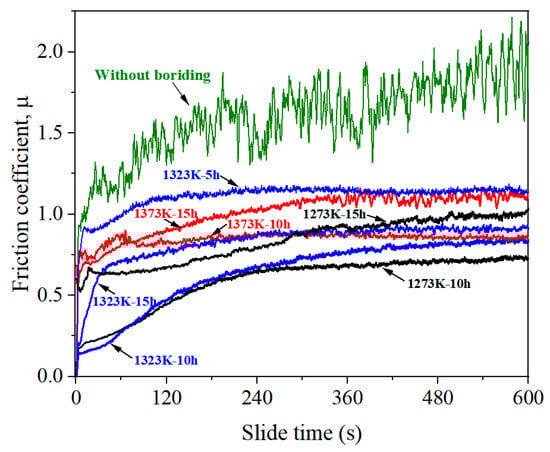 Figure 11 shows the friction coefficient of as-sintered and borided alloys under different reciprocating sliding test conditions. The friction test indicates that pack-borided alloy had a lower value of friction coefficient than that of as-sintered alloy during all test durations, due to the high surface hardness of the borided alloy. The friction coefficients observed at 600 s in this study ranged from 0.73 to 1.13, which was near half of the as–sintered alloy. Moreover, it can be seen that friction coefficient curve of the borided alloy showed a smooth trend, indicating a significant improvement in the surface quality of the alloy after pack boriding treatment. The friction coefficient of the alloys borided at 1323 K for 5 h showed a relatively high value of 1.13, showing relatively poor wear resistance. As treatment time increased to 10 h, the break-in period length increased, and the friction coefficient approached 0.83. As the processing time increased to 15 h, the friction coefficient did not decrease but slightly increased, reaching 0.92. Although the surface hardness increased with treatment time as shown in Figure 10, the friction coefficient showed a tendency to decrease first and then increase with time. Also, the friction coefficients of the alloy after 10 h of boronization at 1273 K and 1373 K were lower than the friction coefficient after 15 h of boronization at the corresponding temperature. In general, the growth of boride layer showed an increasing tendency of hardness simply due to the formation of harder boride phases, but it was not the only reason for the improvement of the wear property of the material. According to the surface uniaxial compression model [36,37], the wear volume of the boride layers is dependent not only on hardness but also on the size of TiB phase. When the size of TiB is small, a higher dislocation density is generated in the friction test near the TiB phase, leading to more improvement in surface tensile flow stress and further improvement in friction performance of the boride layers [37]. As discussed in Section 3.1, a lot of sub-micron-sized (<0.7 μm) TiB were observed in the PM-alloys borided at a relatively low temperature (1273 K and 1323 K) and short time durations (5–10 h), and the number of these tiny TiB whiskers decreased with increasing temperature and time. When the sub-micron-sized TiB whiskers were dominant, the wear resistance may have been mainly governed by fine-grain strengthening effect of the TiB whisker. As the boriding time increased from 10 h to 15 h at a fixed temperature, the amount of sub-micron-sized TiB decreased, while the TiB whiskers continued to grow longer and thicker, resulting in a higher friction coefficient over longer treatment times. When the boriding temperature was increased to 1373 K and the time was 15 h, the sub-micron-sized TiB basically disappeared, and the TiB whiskers grew abnormally, so the friction coefficient at this condition was quite high, showing poor wear performance. When the boriding temperature was 1273 K and the time was 10 h, the alloy had a relatively large amount of sub-micron-sized TiB with a certain length of TiB layers, demonstrating the best wear performance in this study.
