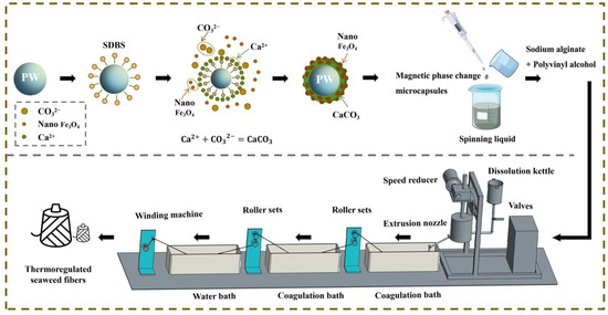 Figure 1 illustrates the mechanism diagram of thermoregulated seaweed fibers preparation. The reaction principle of magnetic phase change microcapsules is as follows. Firstly, PW is dispersed into homogeneous particles under the action of the surfactant SDBS. At this time, the oleophilic groups of SDBS reach out to the PW particles, while hydrophilic groups reach out to the aqueous solution. Secondly, CaCl2 solution is added drop by drop, while Ca2+ approaches the PW particles due to the electrostatic effect and reacts with the hydrophilic groups to form a complex. Thirdly, Na2CO3 solution with Fe3O4 nanoparticles is continuously dripped in. Ca2+ and CO32− react to uniformly encapsulate the PW particles for hybrid shell materials. Finally, the magnetic phase change microcapsule was obtained, as shown in Figure 1. Compared to the in-situ polymerization method used by Ke et al. [15], this self-assembly method for preparing phase change microcapsules has milder reaction conditions, requiring neither high temperatures nor high pressures, thus saving energy consumption and reducing costs.