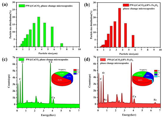 (a,b) Particle size distribution images of PW@CaCO3 phase change microcapsules and PW@CaCO3@8% Fe3O4 phase change microcapsules; (c,d) EDS image of PW@CaCO3 phase change microcapsules and PW@CaCO3@8% Fe3O4 phase change microcapsules.