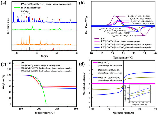 (a) XRD patterns of CaCO3, Fe3O4 nanoparticles, and PW@CaCO3@8% Fe3O4 phase change microcapsules; (b) DSC curves of PW and microcapsules; (c) TG curves of PW and microcapsules; (d) VSM curves of magnetic phase change microcapsules.