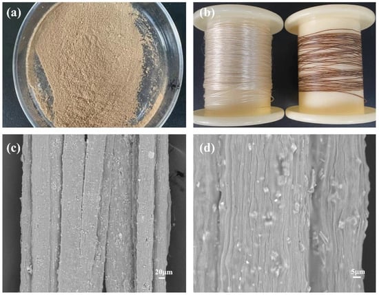 (a,b) Physical drawings of PW@CaCO3@8% Fe3O4 phase change microcapsules and seaweed fibers; (c,d) SEM of seaweed fibers with PW@CaCO3@8% Fe3O4 phase change microcapsules at different magnifications.
