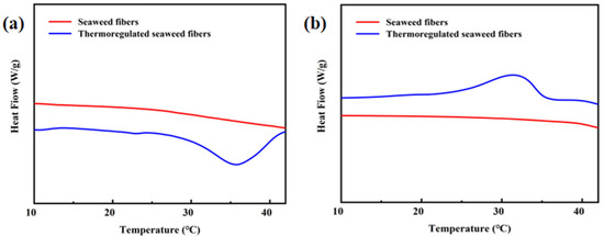Figure 6a,b depicts the DSC curves of the seaweed fibers, while Table 1 provides detailed information on the enthalpies and temperature range. The DSC curves of the samples shown in Figure 6a,b are the DSC curves obtained using DSC tests performed three times for each sample, with the enthalpy values being the median values. All samples were tested under the same conditions. It is evident that pure seaweed fibers do not possess temperature regulation properties. The melting enthalpy and crystallization enthalpy were measured at 19.8 J/g and 19.55 J/g, respectively, with a phase transition temperature ranging from 15 to 39 °C.