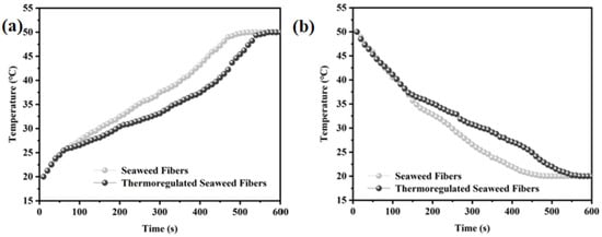 Figure 7a,b shows the time-temperature curve of the sample. The specific operation is as follows: using a flat plate insulation device for heating and cooling operations, while using an infrared thermal imager to measure the temperature at intervals of 0.5 min, and finally plotting the time-temperature curve. Figure 7a illustrates the time-temperature curve of the fibers during warming [21] The seaweed fibers were simultaneously warmed from room temperature to 50 °C. Initially, both fibers exhibited a similar heating rate, increasing to over 25 °C within 1 min. Subsequently, the heating rate of the thermoregulated seaweed fibers slowed down due to the arrival of their phase transition temperature. After 9 min, both seaweed fibers reached approximately 50 °C, indicating that the phase transition properties of the thermoregulated seaweed fibers could be maintained for about 8 min during the heating process. Figure 7b presents the time-temperature curve of the fibers during cooling down [22]. The seaweed fibers were cooled from 50 °C to about 20 °C simultaneously. In the first 2 min, the obtained fibers cooled at a similar rate. Especially by the second minute, their temperatures had dropped below 37 °C. Subsequently, the cooling rate of thermoregulated seaweed fibers decreased gradually. By 9 min, the temperature of the seaweed fibers had reached about 20 °C. This indicates that thermoregulated seaweed fiber has a certain heat buffer performance, which can be maintained for 7 min during the cooling process.