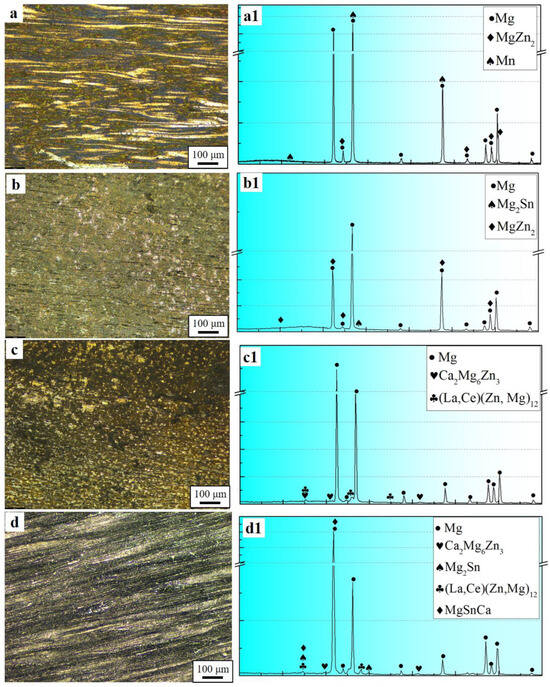 Optical micrographs and XRD diffraction patterns of the extruded rods: (a,a1) ZM31, (b,b1) ZT31, (c,c1) ZMXE3101, (d,d1) ZTXE3101.