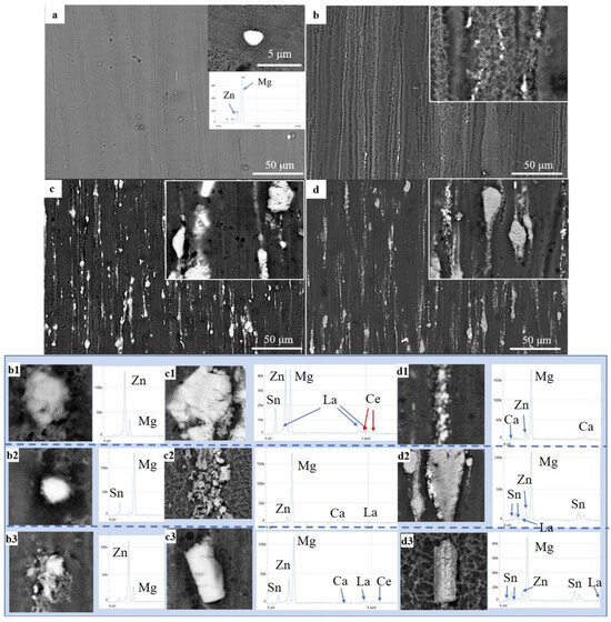Low-magnification SEM morphologies show the distribution of second phases: (a) ZM31, (b) ZT31, (c) ZMXE3101, (d) ZTXE3101; and the typical second-phase morphologies with corresponding EDS analysis results: (b1–b3) ZT31, (c1–c3) ZMXE3101, (d1–d3) ZTXE3101.