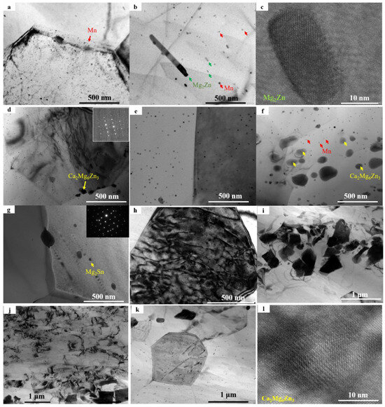 Low- and high-magnification TEM images of as-extruded alloys: (a–c) ZM31, (d–f) ZMXE3101, (g) ZT31, (h–l) ZTXE3101 alloys.
