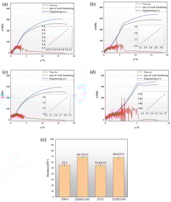 Engineering stress vs. strain curves and hardness values of the present as-extruded samples: (a) ZM31, (b) ZMXE3101, (c) ZT31, (d) ZTXE3101, (e) hardness values.