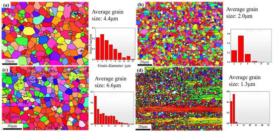Figure 5 presents the EBSD images and recrystallized grain size distributions (derived from EBSD data analysis). From Figure 6a–d, it can be observed that the relationship of the recrystallized grain sizes among these four alloys is ZTXE3101 (1.3 um) < ZMXE3101 (2.0 um) < ZM31 (4.4 um) < ZT31 (6.6 um).