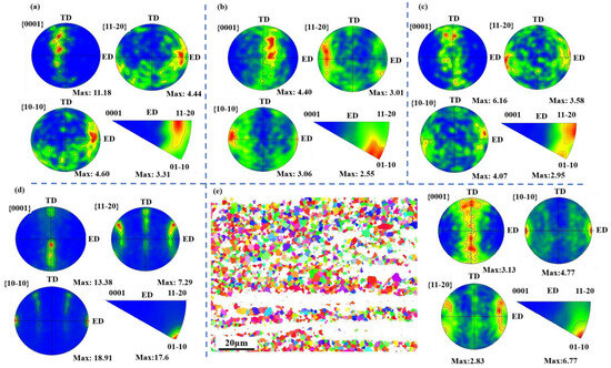 Pole Figures of {0001} {10-10} and {11-20} crystal planes, inverse pole Figures of ED, inverse pole Figures of ED: (a) ZM31, (b) ZMXE3101, (c) ZT31, (d) ZTXE3101. The pole Figure and inverse pole Figure of the recrystallized microstructure in ZTXE3101 alloy: (e).