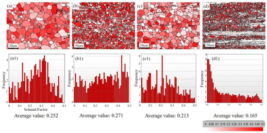 Basal Schmid factor distributions measured by EBSD for as-extruded alloys: (a,a1) ZM31; (b,b1) ZMXE3101; (c,c1) ZT31; (d,d1) ZTXE3101.