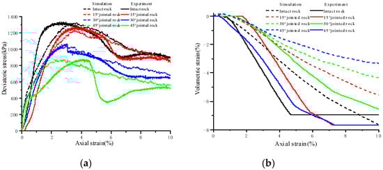 Simulated stress–strain curves of jointed rock samples under the confining pressure of 100 kPa. (a) Deviatoric stress–axial strain curves; (b) volumetric strain–axial strain curves.