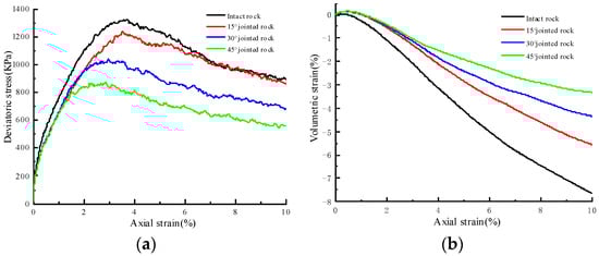 It can be observed in Figure 3b and Figure 4b that volume shrinkage occurs during the initial loading stage of jointed rock samples, specifically when the rock samples are undergoing compaction. At equivalent confining pressures, the maximum volume shrinkage is largest in rock samples with a 45° joint angle, while the minimum is seen in intact rock samples. Although joint surfaces influence the volume shrinkage of rock samples to some extent, there is no significant difference in volume shrinkage between samples with joint angles ranging from 15° to 45°. Following the volume shrinkage phase, the rock samples undergo a period of expansion leading to eventual failure. This dilatancy phenomenon [29,30] exhibits a significantly greater magnitude compared to the preceding shrinkage phase. Under identical confining pressures, the volume expansion at failure demonstrates an approximately linear decrease with increasing joint dip angle. This observation aligns with the data presented in Table 3, which indicates a reduction in crack occurrence as the joint inclination increases. This trend can be attributed to a gradual decrease in joint strength with an increasing joint dip angle, coupled with increased slip along the joint surfaces within the rock matrix and reduced deformation within the matrix.