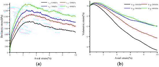 Comparison of simulated and experimental stress–strain curves under a confining pressure of 100 kPa. (a) Deviatoric stress–axial strain curves; (b) volumetric strain–axial strain curves.