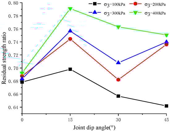 Residual strength ratio of jointed rock samples with different joint angles and different confining pressures.