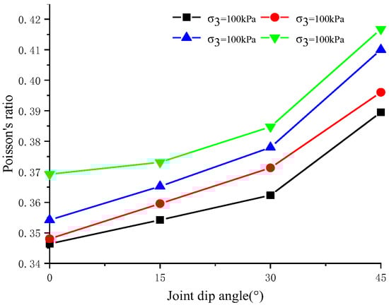 Poisson’s ratio at different joint dip angles and under different confining pressures.