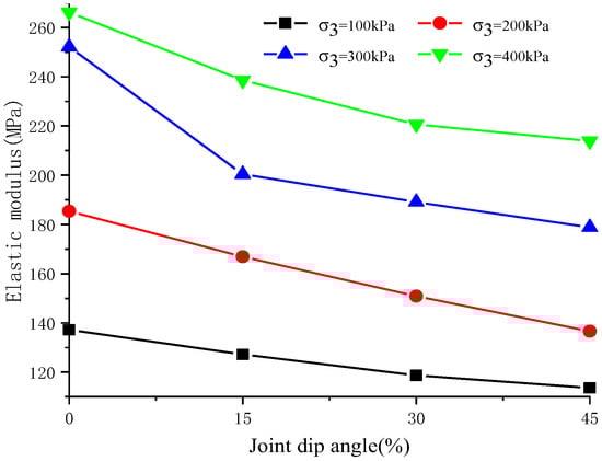 Figure 7 presents the elastic modulus results obtained from tests conducted on soft rocks with varying joint dip angles and different confining pressures. It is evident that at a fixed joint dip angle, the elastic modulus increases with confining pressure, indicating that jointed rock samples exhibit greater resistance to deformation under high confining pressures. Conversely, with constant confining pressure, an increase in joint dip angle leads to a decrease in elastic modulus values, with 45° jointed samples showing the lowest elastic modulus among all the tested configurations. In summary, both joint dip angles and confining pressures influence the elastic modulus behavior of jointed rock samples; nevertheless, the effect induced by variations in confining pressure outweighs that caused by changes in joint dip angles.