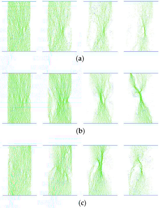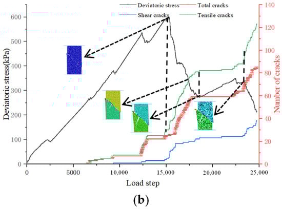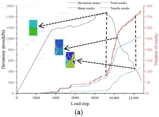 Figure 8 illustrates the simulated and experimental failure modes and failure mechanisms of soft rock with varying joint inclinations under a confining pressure of 100 kPa. When particle bonds are damaged, cracks develop due to shear or tension forces along these bonds. The total number of cracks and the cracks’ orientations can be monitored. Under identical confining pressure, rock samples with intact structures and 15° and 30° joint inclinations all exhibit “X”-type shear failures within the matrix. Conversely, rock samples with a 45° joint inclination initially show significant slip deformation along the joint plane, followed by the formation of a shear band within the matrix, oriented opposite to the joint inclination. The simulation results reveal that besides the primary shear band evident in laboratory tests, secondary shear cracks also contribute significantly to the mechanical properties of jointed soft rock. For lower joint inclinations (e.g., 15° and 30°), the larger angle between the direction of the joint plane and the loading direction results in reduced shear stress on the joint plane, thereby enhancing its resistance to deformation and failure. In these cases, the jointed rock sample does not exhibit noticeable slips along the joint plane, and an “X”-type shear crack directly traverses the structural plane. The strength of these samples is predominantly influenced by the matrix, with strain softening mainly attributed to damage and softening of the matrix. Thus, the failure mode resembles that of intact rock samples, characterized by “X”-type shear failure. At a 45° joint inclination, the angle between the joint plane and the loading direction is larger. In this case, stress on the joint plane exceeds bond strength between structural surfaces, while the stress on cement bonds among particles in the matrix falls far short of its strength, causing a large slip along the joint plane. The slip deformation gradually forms a weak zone along the joint plane. Only when the strength of the joint plane in the slip direction approaches that of the matrix does a shear zone opposite to the joint plane emerge within the matrix. However, due to the lower shear strength of the joint plane in the opposite direction, the bearing capacity of the 45° jointed rock sample is limited. Consequently, the strength and failure of this sample are primarily governed by both the joint plane and matrix, with a predominant influence from the joint plane. Moreover, strain softening is primarily driven by damage and softening within the matrix.