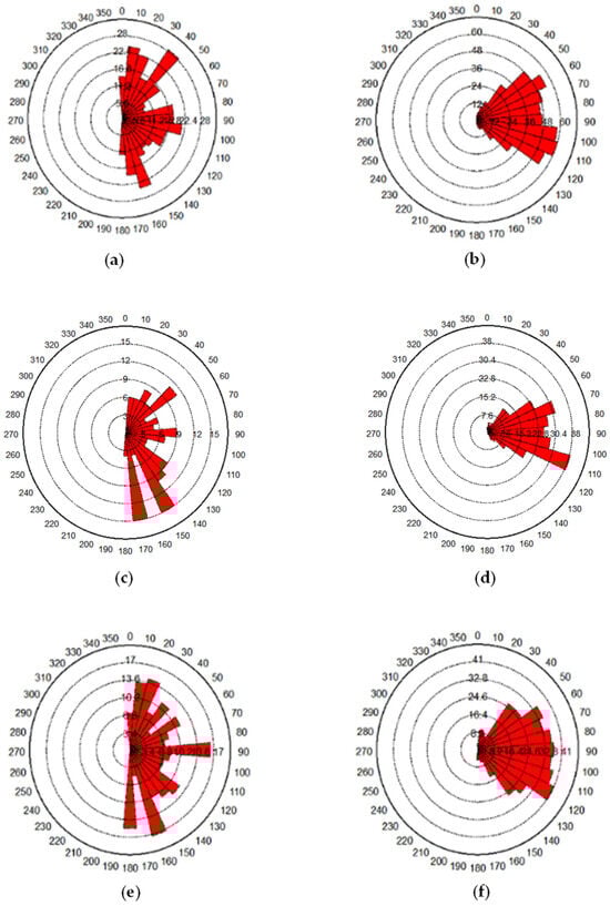 During the loading process of jointed soft rock, the initiation of cracks indicates the rupture of cementation bonds between particles. In the initial loading stage, the rock sample predominantly experiences axial compression and slight radial displacement within the matrix. As loading continues, internal damage within the rock sample escalates, leading to the disruption of force chains and the fracturing of cementation bonds between particles. Figure 9 illustrates the variation in the number of cracks for rock samples with inclinations of 15° and 45° under a confining pressure of 100 kPa. It is evident that the crack propagation in jointed rock samples with different inclinations exhibits similar characteristics, consisting of three distinct stages. The first stage is characterized by slow crack growth. During this stage, from the beginning of crack initiation to the peak stress, the number of cracks increases slowly and the internal matrix structure within the rock sample maintains substantial integrity. The second stage involves rapid crack propagation, extending from the peak stress to the onset of shear zone formation. In this stage, the number of cracks increases rapidly, and shear zones are about to form. The third stage is marked by crack penetration and failure, during which cracks progressively merge to form a shear failure zone. Although the number of cracks still increases rapidly in this stage, the rate of growth is slower compared to the second stage. Table 3 presents the number of cracks in jointed soft rock samples with various dip angles under a confining pressure of 100 kPa. It shows a decrease in the total number of cracks as the joint dip angle increases under the same confining pressure, as well as in the total number of shear or tensile cracks. This trend is consistent with the observation in Figure 7, which shows that the degree of breakage in samples decreases with increasing joint dip angles. Furthermore, each jointed rock sample exhibits approximately twice as many shear cracks as tensile cracks, indicating that mesoscopic failure is predominantly attributed to shearing. Figure 10 displays a rose diagram of crack orientation for jointed rock samples with different dip angles under the confining pressure of 100 kPa. It reveals that no matter whether the joint dip angle is large or small, shear cracks predominantly occur at angles between 70° and 110°, mainly near the axial loading direction. Conversely, tensile cracks are primarily observed at angles between 0° and 20°, and 160° and 180°, closer to the horizontal direction.