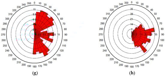 Rose diagram of crack orientation for rock samples under a confining pressure of 100 kPa. (a) Tensile cracks of intact rocks; (b) shear cracks of intact rocks; (c) tensile cracks of 15° jointed rocks; (d) shear cracks of 15° jointed rocks; (e) tensile cracks of 30° jointed rocks; (f) shear cracks of 30° jointed rocks; (g) tensile cracks of 45° jointed rocks; (h) shear cracks of 45° jointed rocks.