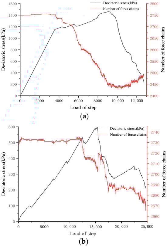 Evolution of the number of force chains in 15° and 45° rock samples under a confining pressure of 100 kPa (a) at a joint dip angle of 15° (b) and a joint dip angle of 45°.