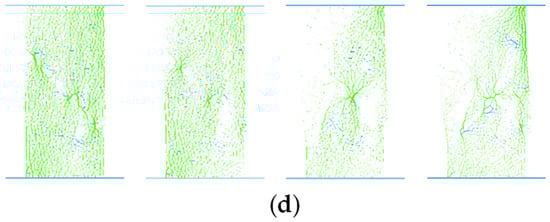Force chains are structures of contact forces connecting grains in a chain-like manner, representing the path of force transmission. A strong force chain is characterized by a nearly linear alignment and contact forces between grains that exceed the average force. Conversely, a weak force chain forms when contact forces are below the average. Figure 11 depicts the evolution curves of force chain numbers in soft rock with 15° and 45° joint inclinations under a confining pressure of 100 kPa. It is evident that the variation in the number of force chains for different inclinations exhibits two distinct stages. Initially, numerous force chains exist without any visible cracks, resulting in a relatively stable number of force chains; subsequently, as cracks begin to form and propagate, the number of force chains decreases continuously. Notably, temporary increases in the number of force chains may occur, which are associated with crack closure and the redistribution of forces within the rock sample. Figure 12 illustrates the changes in the distribution of force chains within rock samples with different joint dip angles under a confining pressure of 100 kPa. In this diagram, green represents pressure chains, while blue denotes tension chains. From left to right, the deviatoric stress values correspond to 90% of the peak strength in the pre-peak stage, followed by 80%, 40%, and finally 20% of the peak strength in the post-peak stage.