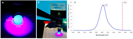 (A) The distance of the resin-based composite sample was between 0 and 0.5 mm from the CC3 detector (behind). (B) The Woodpecker O-Star curing light was fixed 20 mm above the RBC. The sample was centred under the UV spot. (C) The spectral radiant power (mW/nm) of the light from the Woodpecker O-Star. Emission peak at 402 nm. Beyond 435 nm, no light was detected.