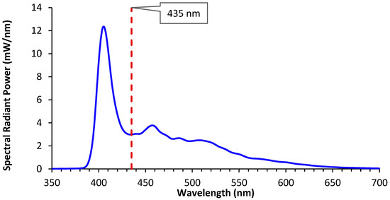The four spectra for each trial were averaged to determine the opalescence and fluorescence of the RBCs. The area of the curve was then obtained from 350 to 435 nm (Equation (1): opalescence) and 435 to 700 nm (Equation (2): fluorescence) by multiplying the differences between the wavelengths () by the spectral radiant power (SRP) and adding up the values. No light was emitted from the LCU above 435 nm (Figure 1C). Thus, the 435 nm point was chosen as the transition point between the opalescence, which peaked at the same wavelength that was added to the system (@~402 nm), and the fluorescence, which had multiple emission peaks beyond 435 nm (Figure 2). This produced both the opalescence and fluorescence values for each RBC.