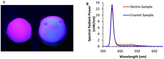 (A) Samples of the two human teeth that exhibited the most consistent colour and light emittance. The sample on the left was mostly enamel, and the sample on the right was mostly dentin. (B) Reflected spectra from the same two tooth samples showing relatively similar wavelength peaks.
