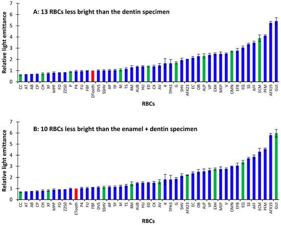 The relative light emittance was lower for 13 RBCs compared to the dentin sample and 10 RBCs for the enamel-plus-dentin sample. However, a few RBCs were up to six times brighter than the samples of human teeth. The highest relative light emittance was observed for the GUI RBC, whereas the lowest relative light was observed from CC (Figure 4A,B).