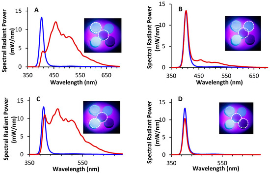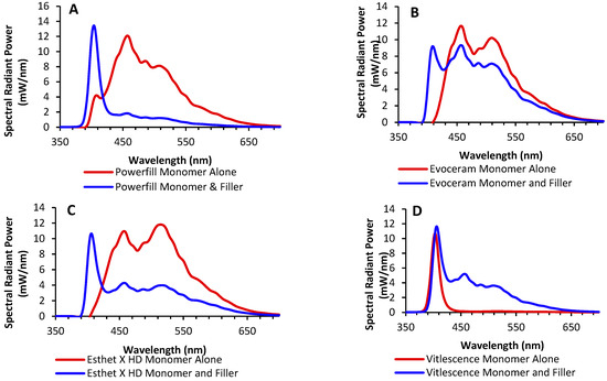 Four contrasting resin-based composites (RBCs) placed adjacent to one another with the enamel + dentin tooth sample in the center and exposed to UV light. The spectra for the RBCs is displayed by the red line adjacent to the spectra of the enamel + dentin tooth sample (blue line): (A) PowerFill monomer alone, (B) PowerFill monomer and filler, (C) Admira Fusion X-tra, and (D) Activa Bioactive Restorative.
