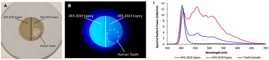 (A) Admira Fusion X-tra (AFX) samples with an expiry of 2019 and samples with an expiry date of 2023 under regular lighting plus the regular tooth sample. (B) AFX samples with an expiry of 2019 and expiry of 2023 under UV lighting, plus the regular tooth sample. (C) Spectrum for the 2023 expiry AFX, the 2019 expiry AFX, and the tooth.