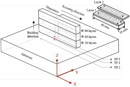 In order to monitor the temperature variation in the deposition process in situ, two thermocouples were placed on the substrate. The point of the first thermocouple is located at the midpoint of the first deposition layer in the longitudinal direction (X direction), with a vertical distance of about 0.5 mm in the transverse direction (Y direction), called temperature point 1 (TP1). The point of the second thermocouple is located at one-third of the first deposition layer in the longitudinal direction, with a vertical distance of about 2 mm in the transverse direction, called temperature point 2 (TP2), as shown by the red dots in Figure 1. An industrial camera (Balser company, Monheim am Rhein, Germany) was used to obtain in situ strain data using the digital image correlation (DIC) method [22,23], and X-strain data at a position 1 mm above the deposition/substrate interface were extracted and called SP 1, as shown by the blue dots in Figure 1. The specimens along the cross-section perpendicular to laser scan direction were cut. The grain size, grain boundary, and geometric dislocation density (GND) of nine regions in three as-deposited samples with different locations from the substrate (bottom/middle/top regions of 30/60/90 layers) were observed using EBSD. The cross-sections of the samples were firstly polished with 800#-1200#-2000# grade sandpaper and then polished with 1 μm diamond paste. Finally, 8% perchloric acid and 92% ethanol mixed electrolyte were used to electropolish at 20 V DC for 40 s. The step size is 3 μm in the range of 750 μm × 750 μm. The EBSD data were analyzed by Channel 5 (by Oxford Instruments) and MTEX open-source software, which can be installed in the MATLAB toolbox. These data were used to examine the effect of dynamic recrystallization, which is caused by subsequent thermal cycles, on grain size and GND under different temperature and strain conditions. According to the grain misorientation, low-angle grain boundaries (LAGBs) and high-angle grain boundaries (HAGBs) are determined as follows: angles of 2° to 15° are defined as LAGBs, while HAGBs displays misorientation angles > 15° [14]. The metallographic picture with δ-ferrite and γ-austenite phases of the same regions as mentioned above were characterized on etched cross-sections by means of scanning electron microscopy (SEM), in conjunction with energy-dispersive spectroscopy (EDS). Aqua regia, which is a mixture of concentrated hydrochloric acid (HCl) and concentrated nitric acid (HNO ₃) in a volume ratio of 3:1, was used to etch the cross-section surface polished with sandpaper and diamond paste for about 9 s. The solidification mode of the crystal can be preliminarily determined by observing the composition of δ-ferrite, γ-austenite, and the ratio of Cr eq. and Ni eq. in SEM data. The EBSD-SEM-EDS testing equipment was a Helios Nanolab 600i.